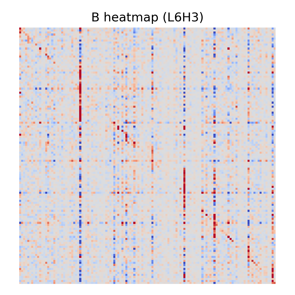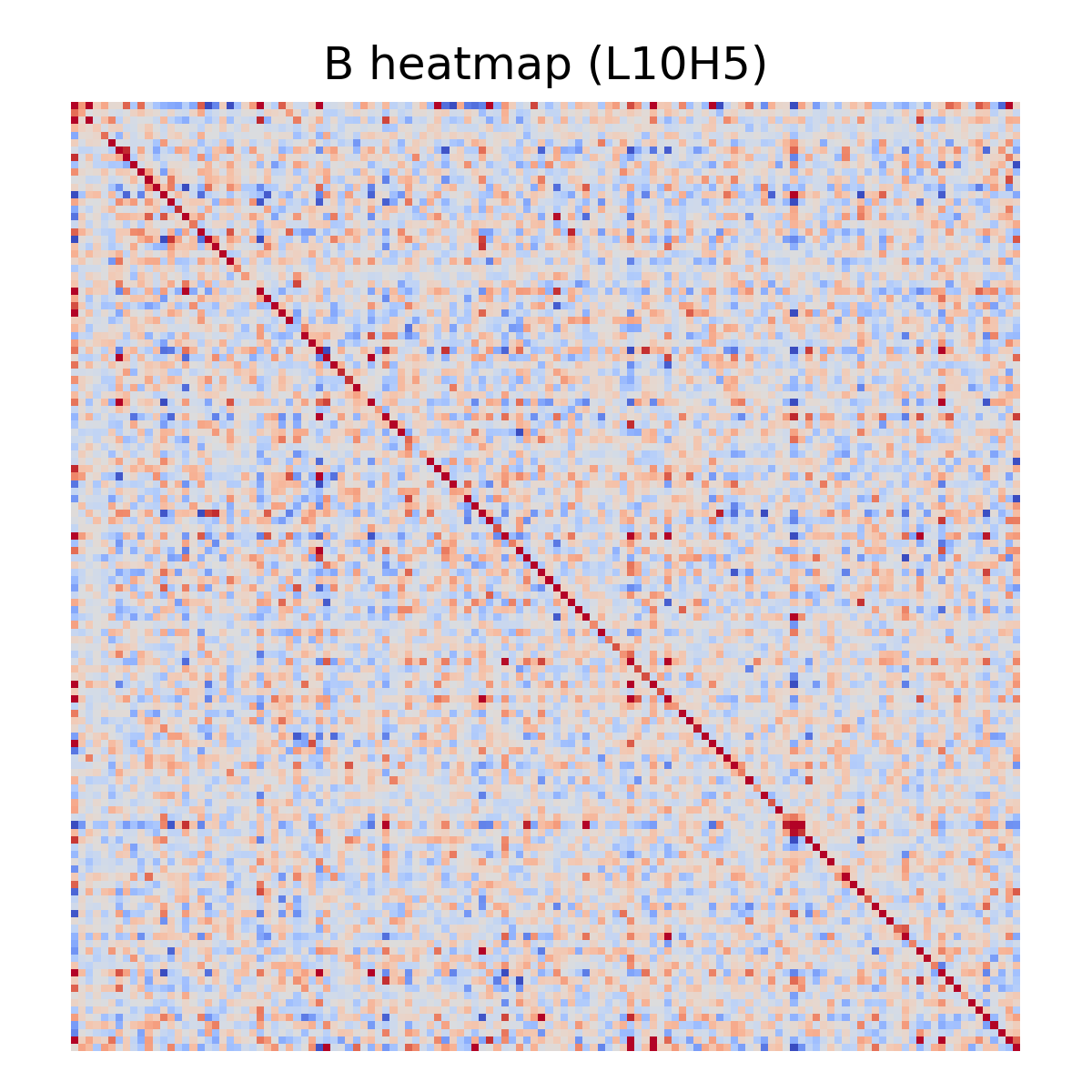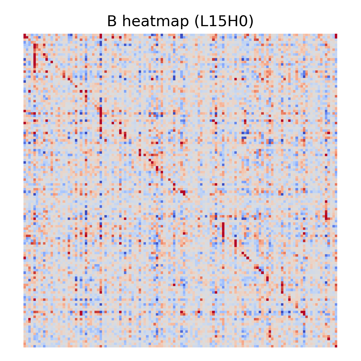 Avoidance: Negative entries in B indicate low dot-product affinity. I treat extreme negative tails as a signature of selective exclusion, but it’s not the same thing as suppression unless the OV path also writes negative feature directions.