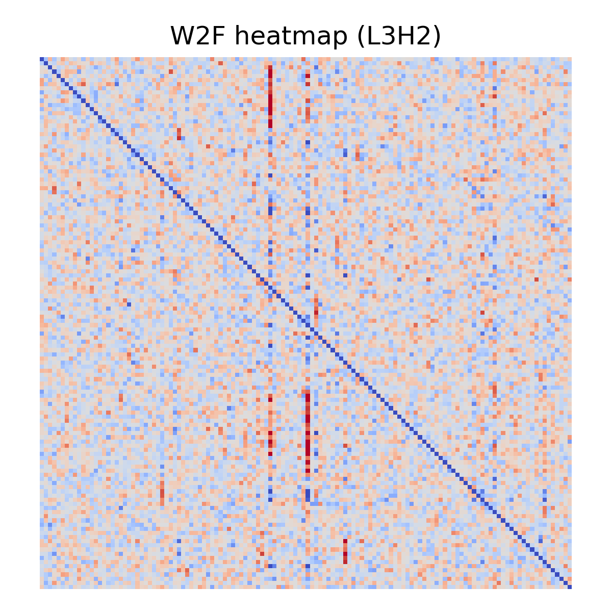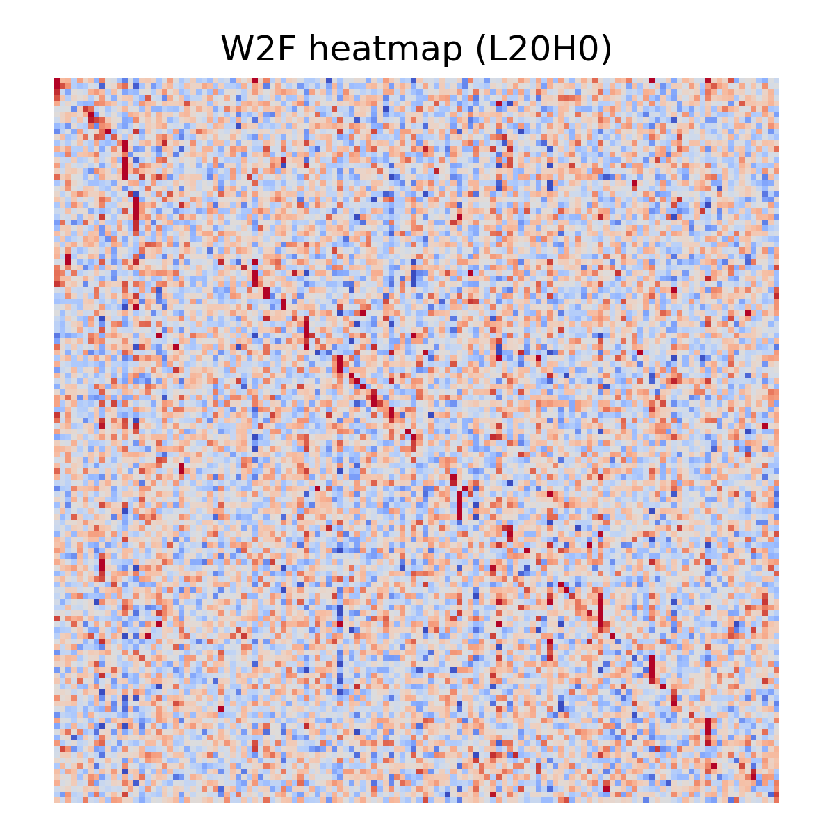 Note: W2F uses cosine similarity, so it measures directional alignment and discards magnitude; later I’ll also report write norms / activation-grounded deltas so ‘aligned-but-tiny’ writes don’t get over-interpreted.