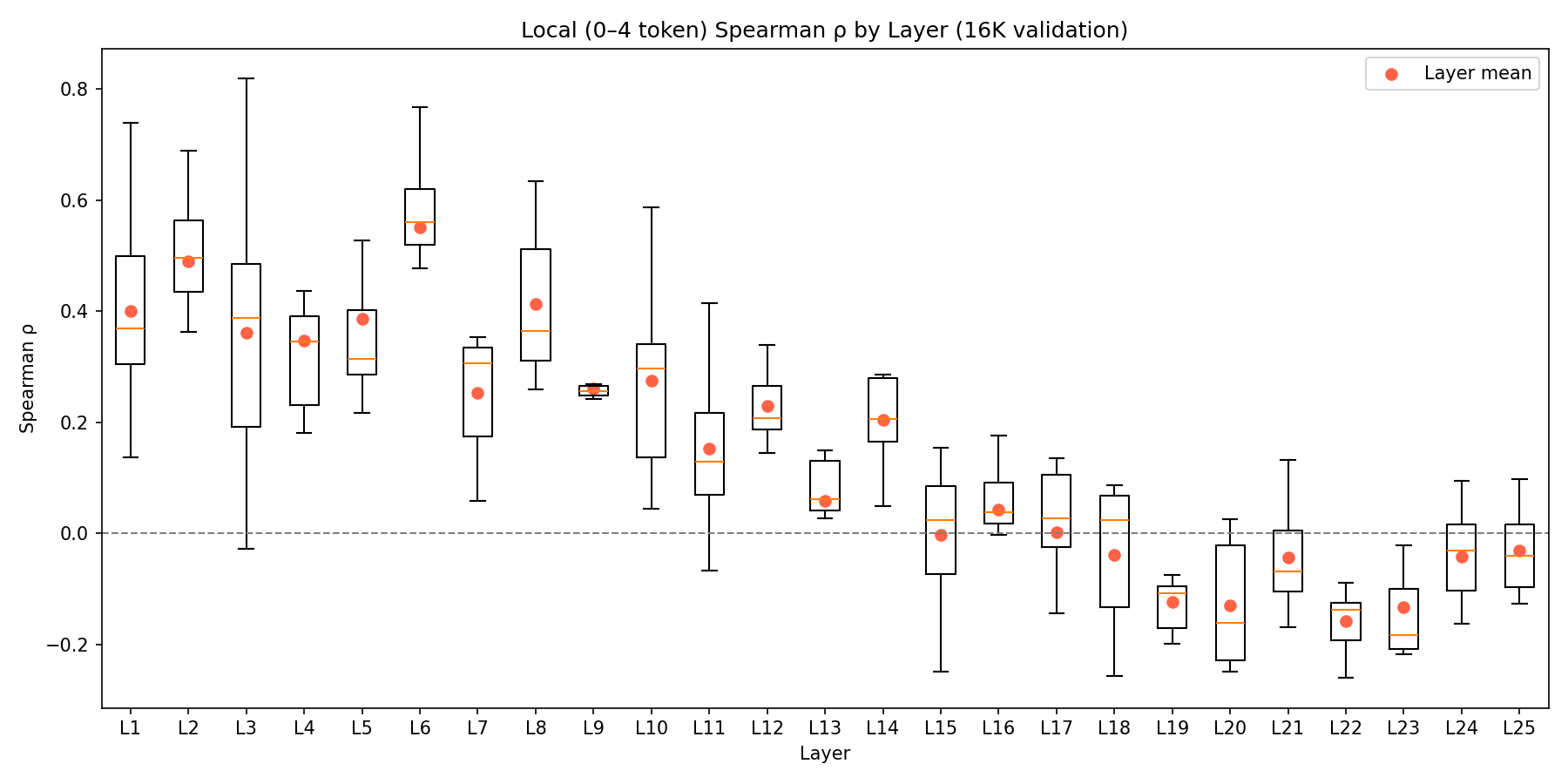 - Mean local (0–4 tokens) Spearman \rho = 0.15 (max=0.82)