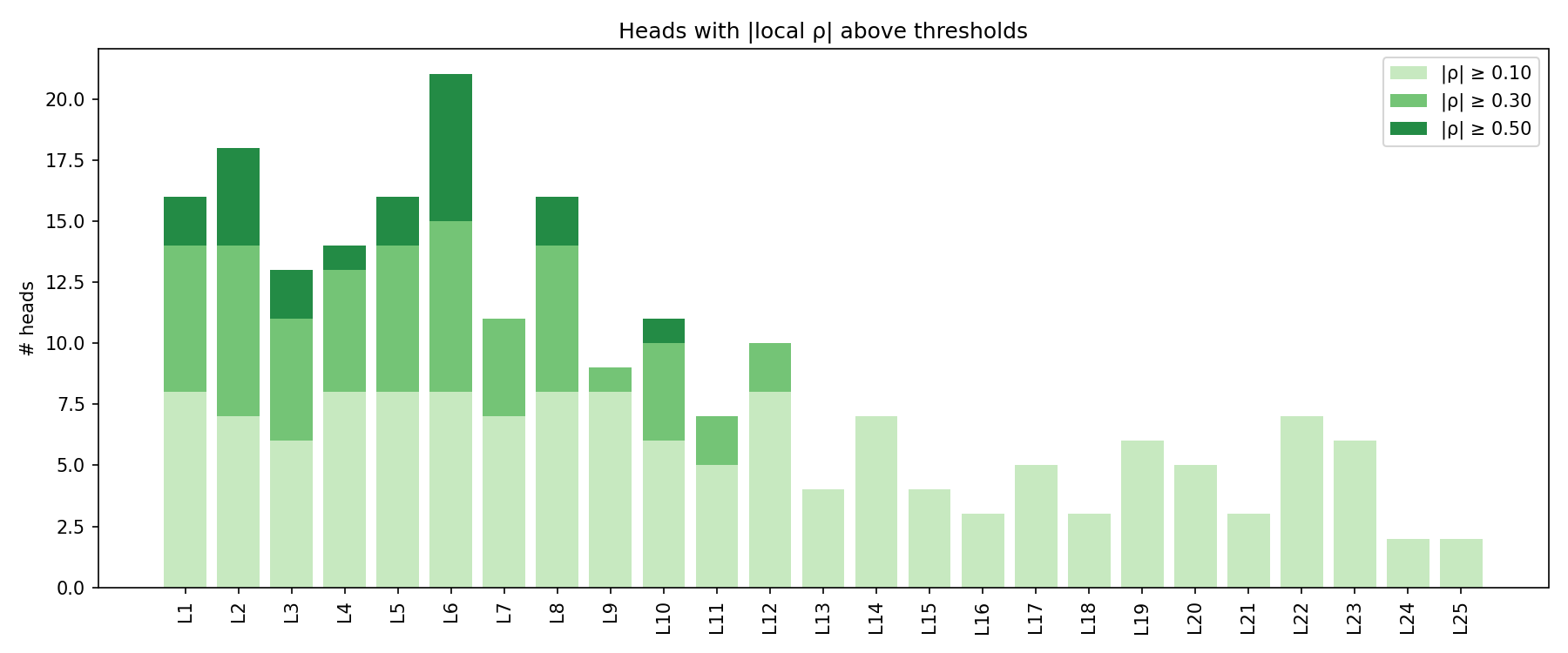 - 144 heads (72%) show |\text{local } \rho| > 0.1 (‘structured’ routing)