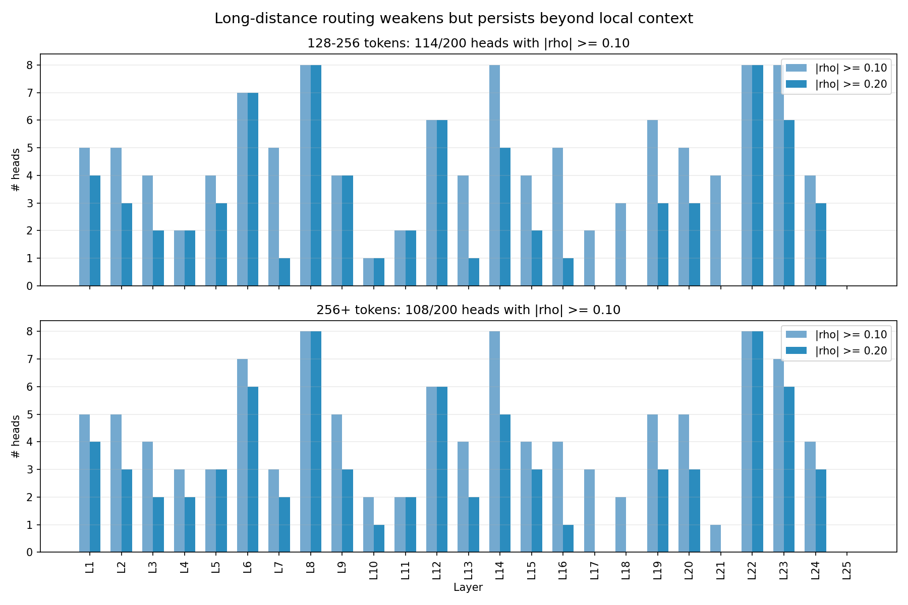 - Long-range routing structure weakens but persists: 114/200 heads clear |\rho| \geq 0.10 at 128–256 tokens, 108/200 at 256+.
