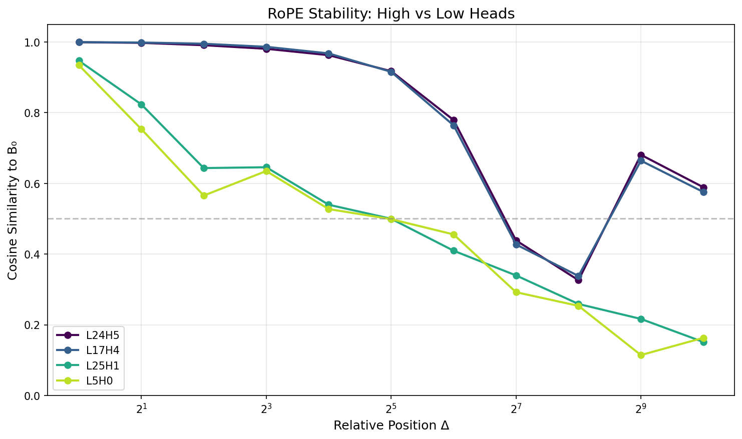 Then compress the curve across \Delta into a single number (AUC-style over log-distance). I call this RoPE stability: a summary of how similar the affinity matrix B stays as we apply relative-position rotations. Also, we apply the tanh softcap before comparing matrices.