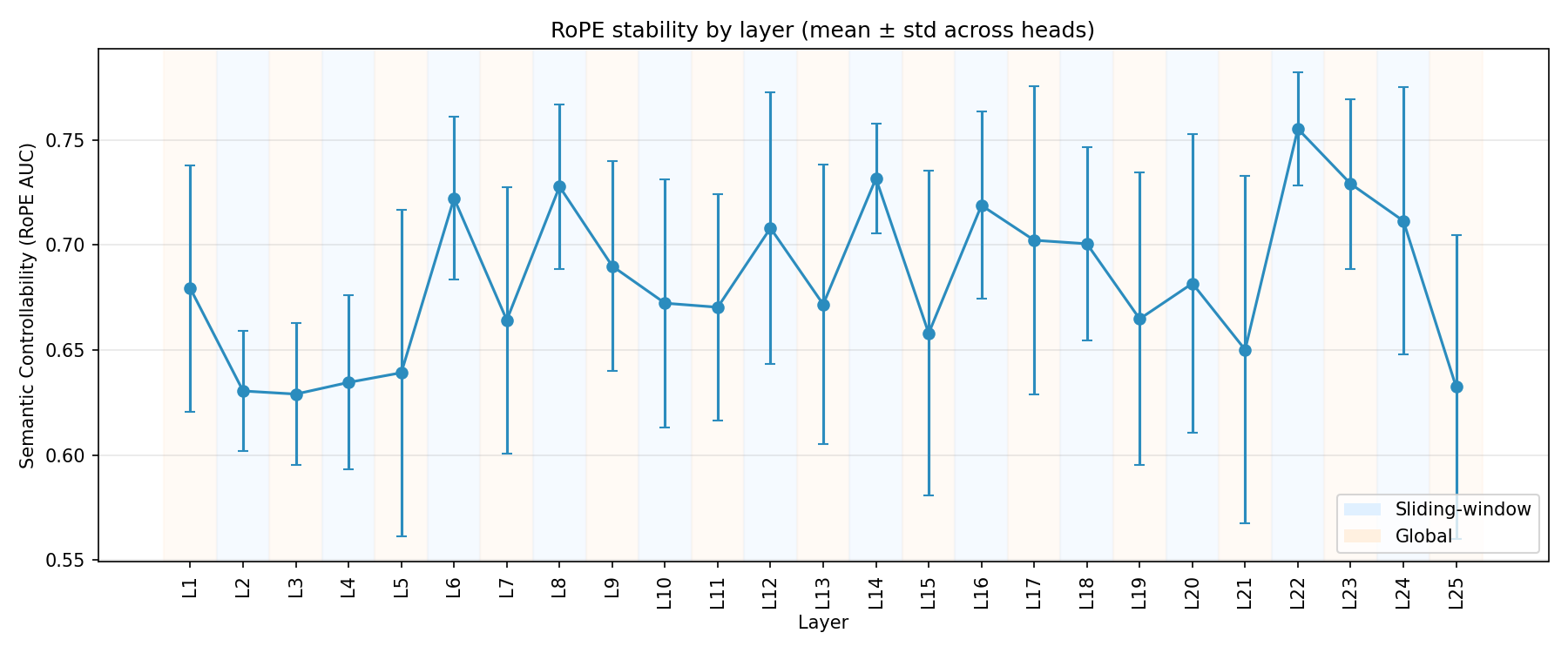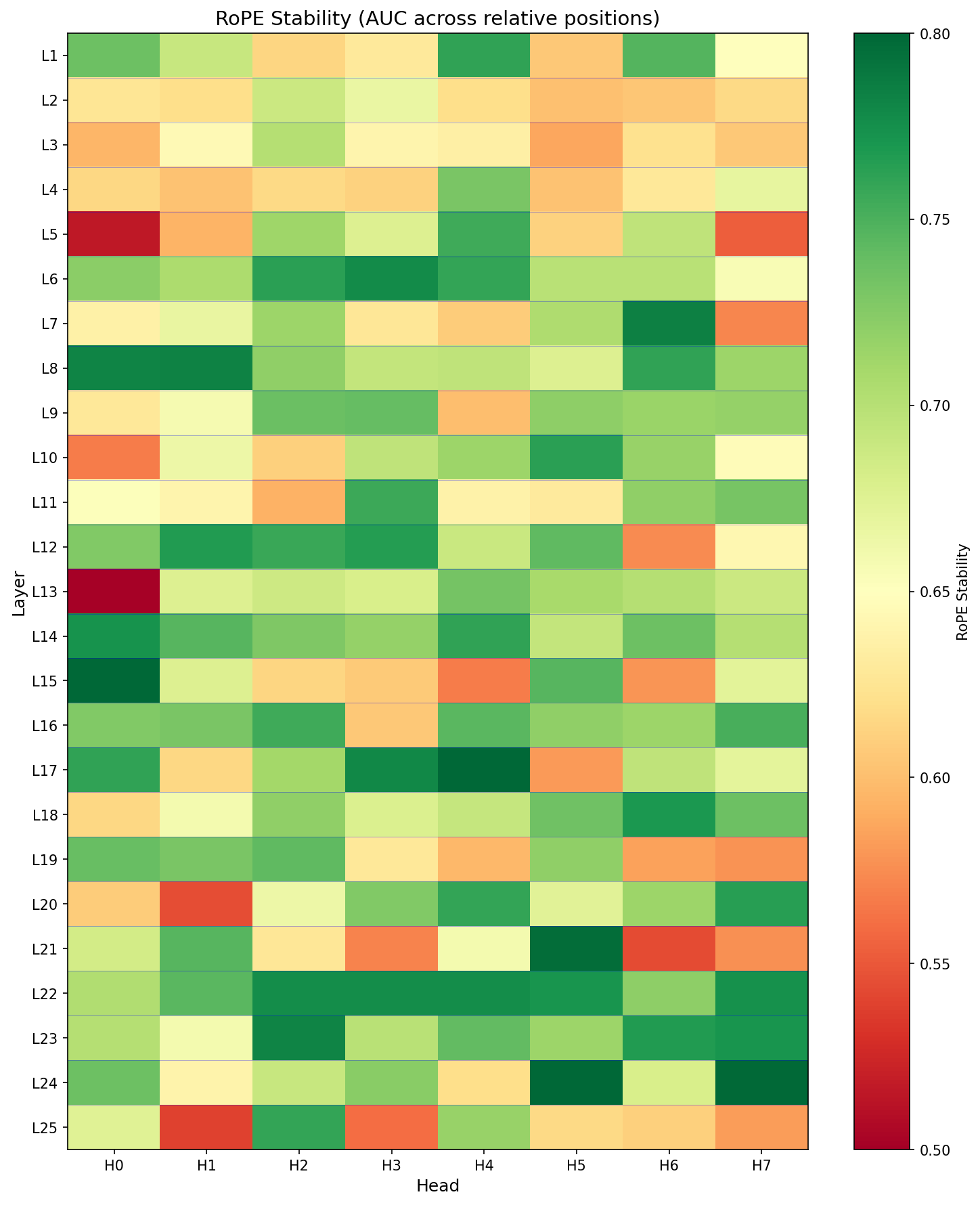 RoPE stability tends to increase with depth, but it’s not smooth. There are high-stability bands (mid layers and a late cluster near the top of the network).
