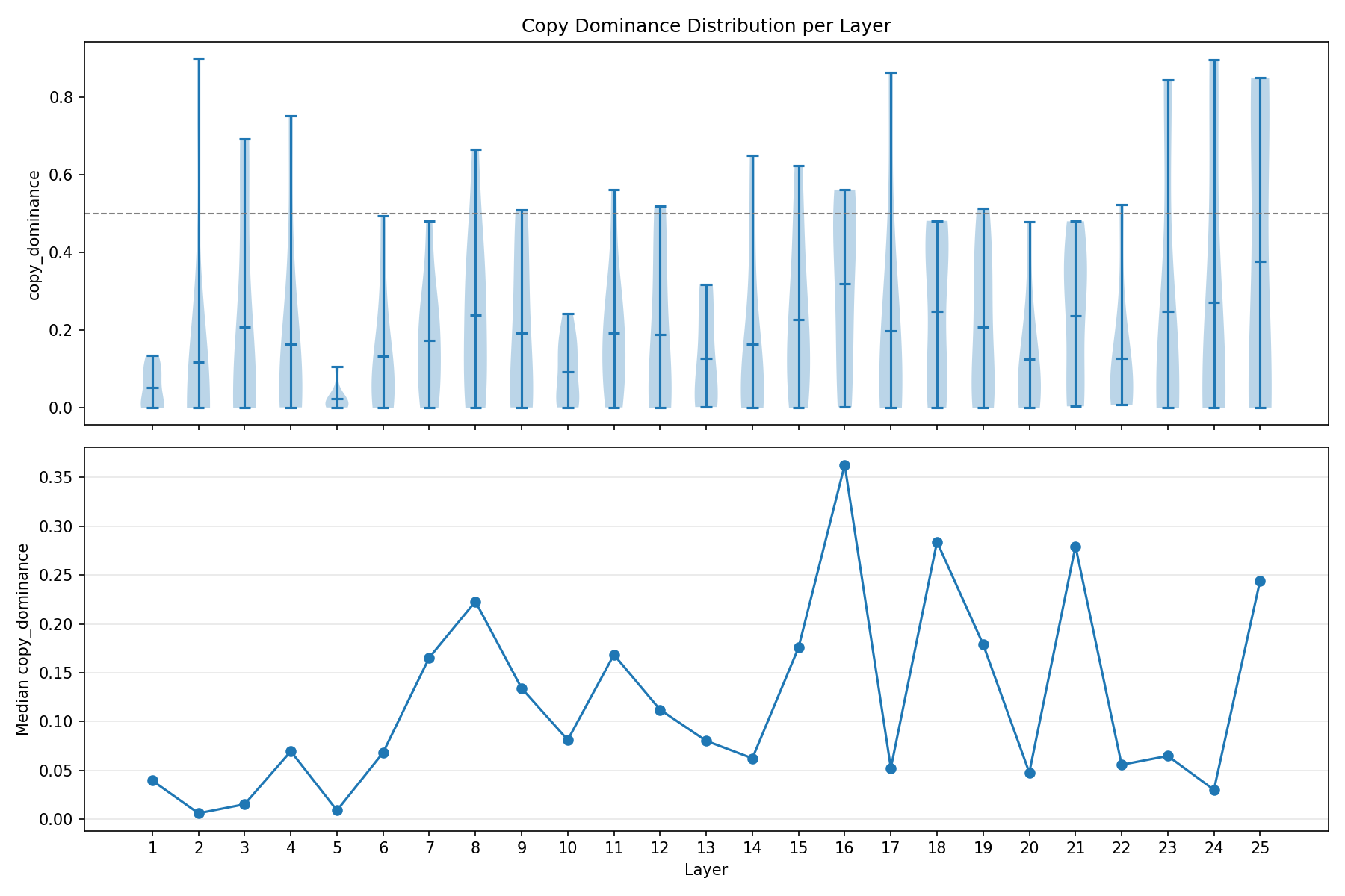 Copy dominance remains low on average (mean 0.186), but the more informative pattern is the upper tail: the strongest copy head is the early outlier L2H2 (0.897), while a secondary cluster of near-copy heads appears in L23–L25. The distribution by layer is shown in Figure 7.