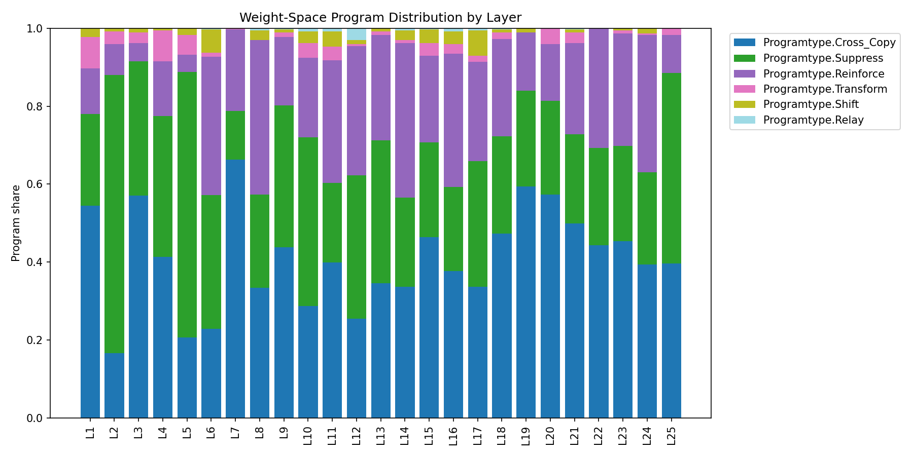 The program distribution by layer (Figure 19) makes this concrete: early layers carry substantial SUPPRESS (peaking in L2/L4–L6) alongside CROSS_COPY, mid layers mix CROSS_COPY / SUPPRESS / REINFORCE, and late layers tilt toward CROSS_COPY. The dominant program motif changes with depth even when the global histogram looks stable.