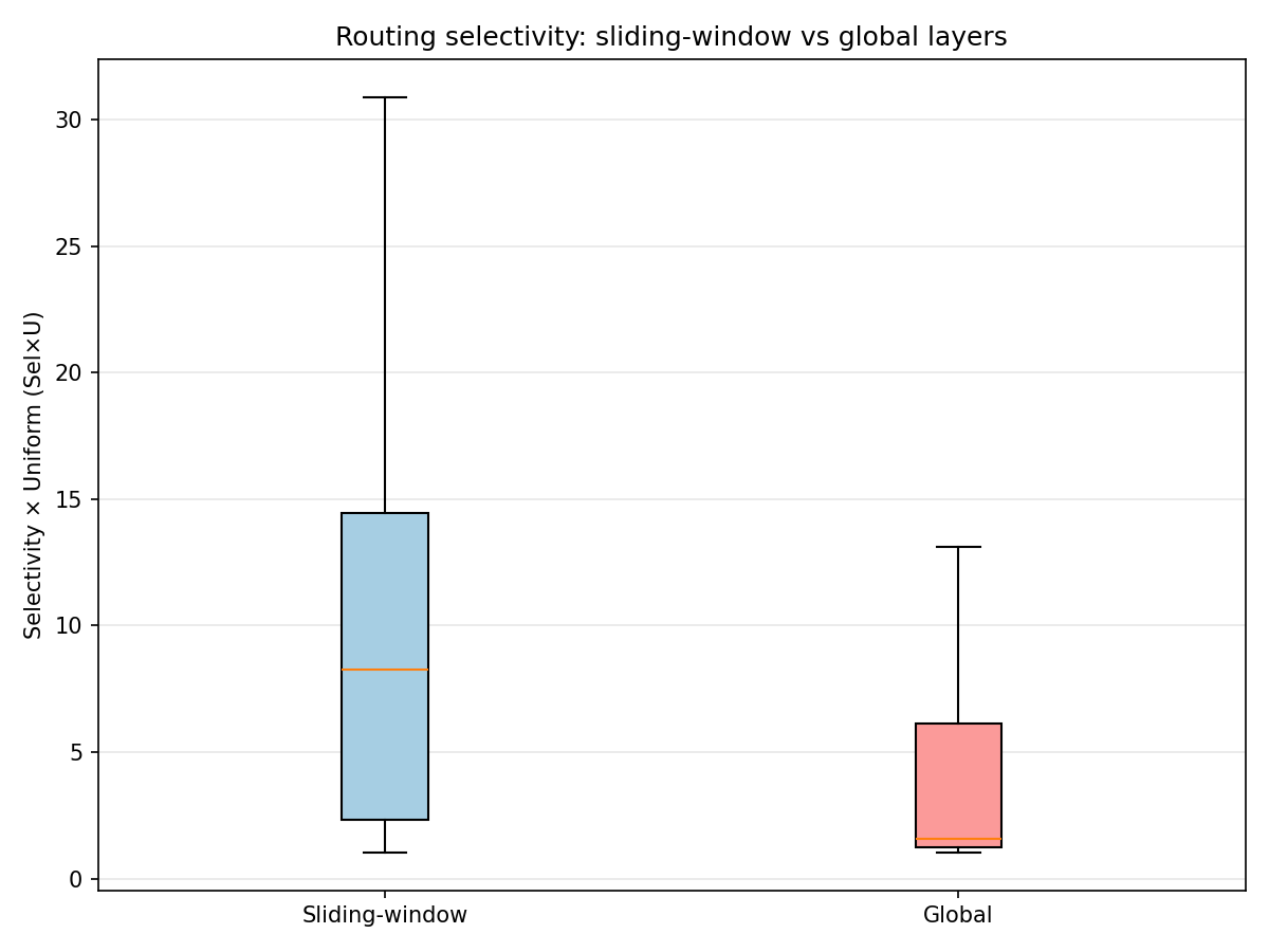 The Layer 6 spike was the single most dramatic finding – Sel\timesU of 105 means the routing structure is two orders of magnitude above uniform baseline. I expected a smooth gradient, not a spike. This showed up consistently across different feature subsets and seeds. Layer 6 is a sliding-window layer (even index) in the range where induction-like heads are typically found, and four of its heads (L6H0, L6H2, L6H3, L6H4) are among the top-10 validation-confirmed heads. The spike-rather-than-gradient pattern suggests a sharp regime change in routing behavior at this depth.