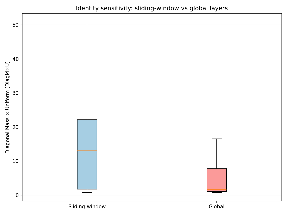 Identity sensitivity: how much softmax probability lands on the diagonal entry (i attends to i) – “diagonal softmax mass”
