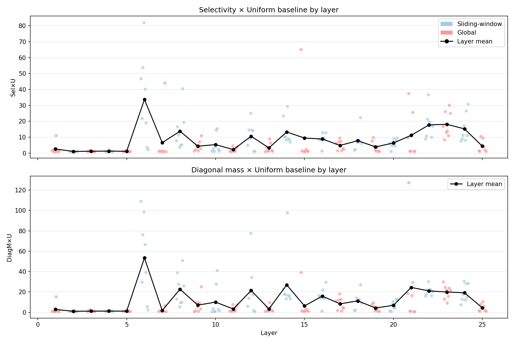 In my current run, there’s a very strong spike in these metrics around a mid layer (one layer stands out dramatically on both selectivity and diagonal mass). That suggests a “band” of unusually crisp routing behavior rather than a smooth trend.