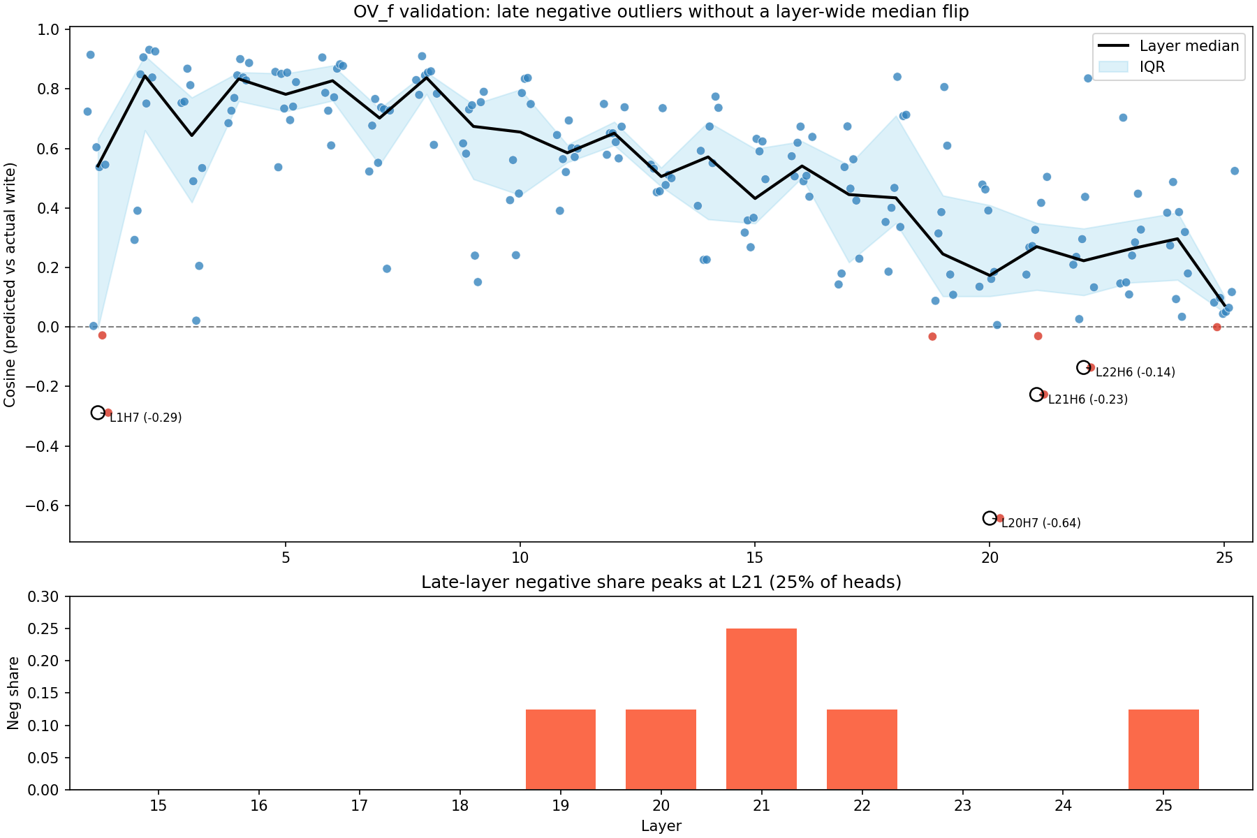 OV validation shows a different failure mode from QK routing: late layers develop negative outliers, but not a layer-wide median inversion. Most late-layer medians stay positive, yet a subset of heads flips sign, peaking at 25% negative heads in L21; the strongest outlier is L20H7 at cosine = -0.64.
