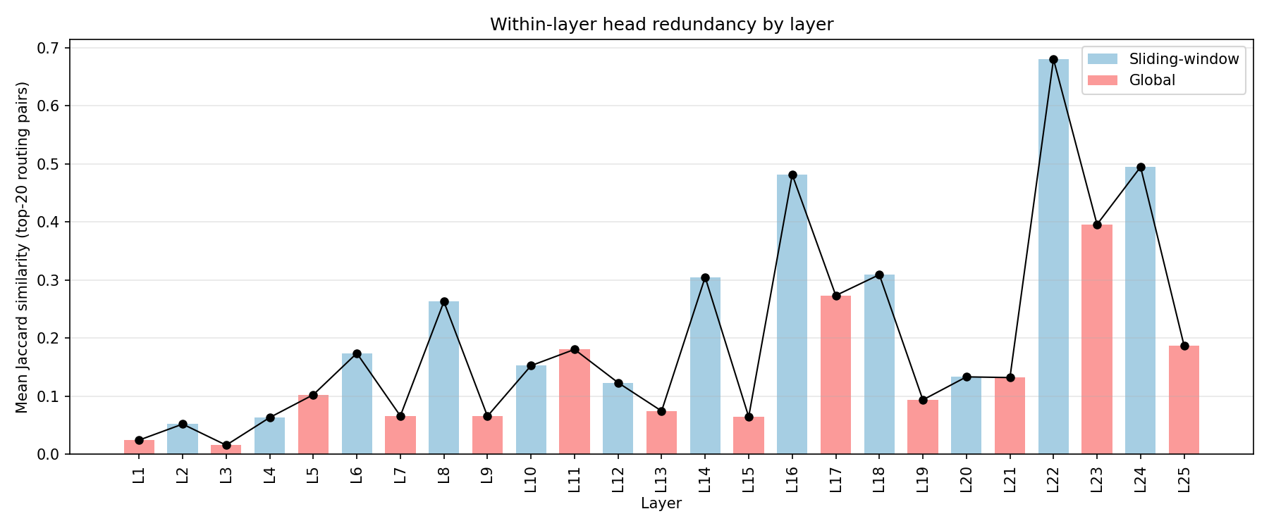 I track how redundant heads are within a layer (do they “do the same thing” in program space?). Redundancy = Jaccard similarity of top-20 routing pairs between heads – that is, |A \cap B| / |A \cup B| where A and B are each head’s set of top-20 (query \to key) feature pairs. Two heads are considered redundant if they route the same feature pairs highly: